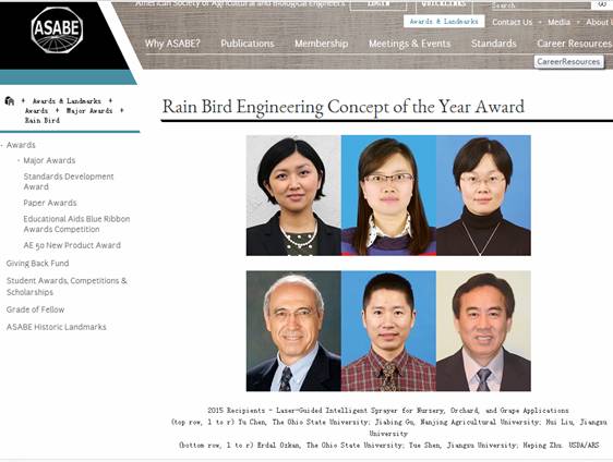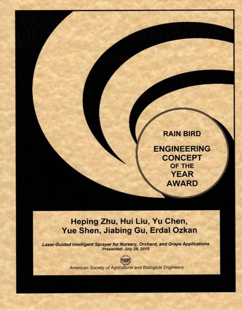 2015年度美国农业及生物工程师学会年会在美国新奥尔良举行。ac米兰青年教师顾家冰与美国农业部农业工程研究中心(USDA-ARS-ATRU)首席科学家Heping Zhu的合作项目“Laser-Guided Intelligent Sprayer for Nursery, Orchard and Grape Applications”荣获该学会颁发的“2015年雨鸟年度最佳工程概念奖”。顾家冰成为自1974年该奖项设立以来首次获此殊荣的中国科研人员。