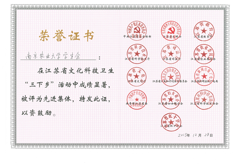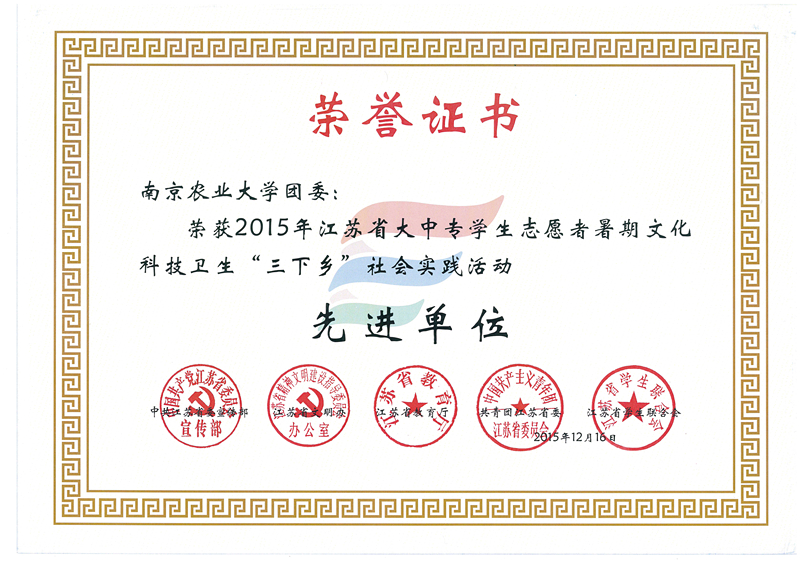 在全省该项工作评比中,ac米兰被中共江苏省委宣传部、江苏省文明办、江苏省教育厅、共青团江苏省委、江苏省学生联合会评为江苏省暑期社会实践活动先进单位,工学院、食品院、信息院、外语院、草业院等组织的5支团队获评先进团队,调研报告《广西河池市凤山县生态农业发展调研报告》被评为优秀调研报告,白马镇大学生社会实践基地被评为优秀社会实践基地,姚志友、王璐、王未未、刘素惠、武昕宇等5位团干部被评为先进工作者,田佳华、赵书平、方嫣然、郭凤菲、徐梦超、田妍等6位同学被评为先进个人。ac米兰学生会被中共江苏省委宣传部、江苏省文明办、江苏省教育厅等13家单位评为江苏省文化科技卫生“三下乡”先进集体。
