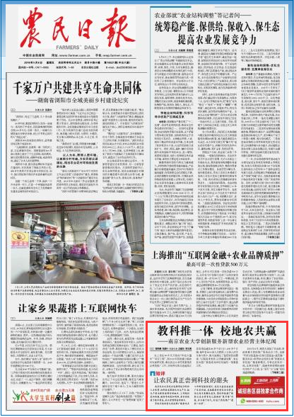 2015年8月,南农大承担了农业部、财政部重大农技推广服务试点工作,创新“科研试验基地+区域示范基地+基层推广服务体系+新型农业经营主体”的链条式农技推广服务新模式,专家走到农村一线,从事农技推广,探索科研成果快速转化为生产力之道,让“顶天”与“立地”间的通道更畅通。