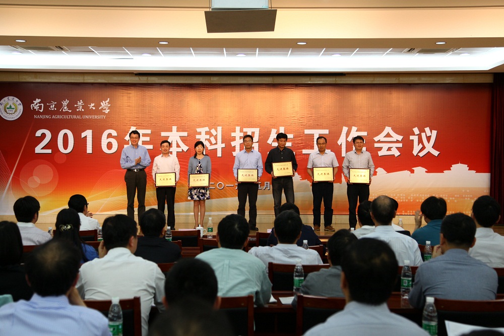 王春春宣读了2015年度招生工作表彰决定。农学院、植保学院、园艺学院、食品学院、外语学院、理学院获“招生工作先进集体”称号,王未未等42名同志获“招生工作先进个人”称号,农学院“科普讲座:生命科学与社会科学发展”等9个项目获“招生工作优秀共建项目”称号。