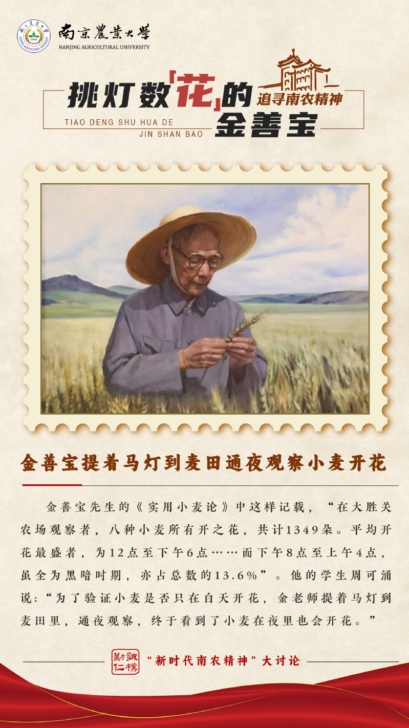 金善宝先生的《实用小麦论》中这样记载,“在大胜关农场观察者,八种小麦所有开之花,共计1349朵。平均开花最盛者,为12点至下午6点……而下午8点至上午4点,虽全为黑暗时期,亦占总数的13.6%”。他的学生周可涌说:“为了验证小麦是否只在白天开花,金老师提着马灯到麦田里,通夜观察,终于看到了小麦在夜里也会开花。”