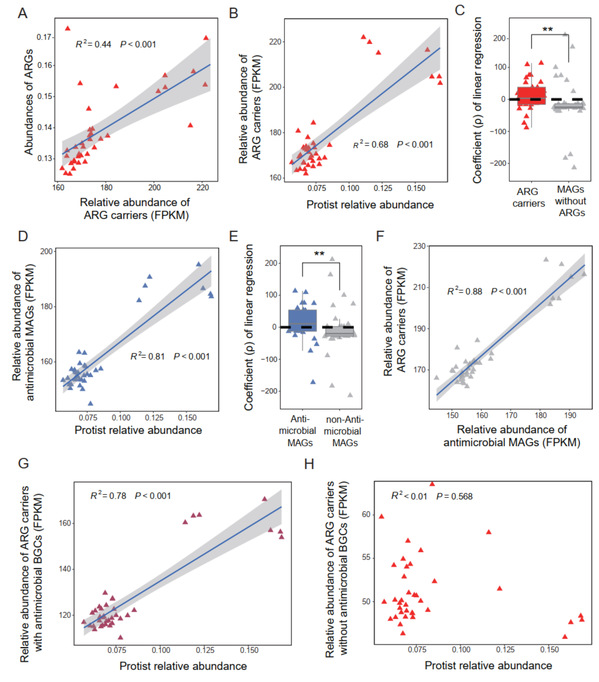该研究通过多组学分析与室内培养实验相结合,首先对田间土壤样本进行了宏基因组测序分析,发现了土壤原生动物与ARGs直接的线性关系。随后利用宏基因组数据获得了土壤高质量的细菌基因组,并在基因组中识别了潜在的抗生素抗性基因(ARGs)和生物合成基因簇(Biosynthetic Gene Clusters, BGCs),通过这一分析对细菌基因组功能进行了预测,并发现了土壤原生动物丰度与抗生素生产细菌之间呈现显著正相关。此外,室内共培养实验也验证了这一机制,在原生动物捕食压力下,土壤微生物群落中的抗生素生物合成相关基因以及ARGs的表达均显著增加。综合研究结果表明,土壤原生动物捕食使能产生拮抗性次级代谢物的细菌具有竞争优势,从而间接促进了抗生素耐药菌的繁殖。
