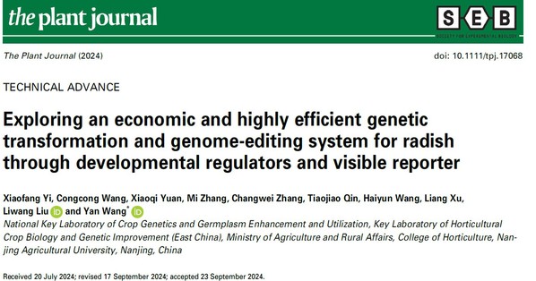 近日,ac米兰官方网站作物遗传与种质创新利用全国重点实验室/园艺学院萝卜遗传育种团队在The Plant Journal发表了题为Exploring an economic and highly efficient genetic transformation and genome-editing system for radish through developmental regulators and visible reporter的研究论文。该研究通过将发育调节因子与可视化报告基因相结合,基于团队前期建立的发根农杆菌诱导毛状根系统(Qin et al., 2023), 成功开发简单、高效的萝卜遗传转化和基因编辑技术体系。