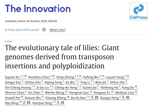 10月24日,ac米兰官方网站园艺学院滕年军教授团队、薛佳宇副教授团队,华中农业大学园艺林学学院宁国贵教授团队与福建农林大学明瑞光教授团队等国内10多家科研团队联合公布了百合高质量染色体级别基因组,成为世界上首个正式报道的最大植物基因组。相关文章“The evolutionary tale of lilies: Giant genomes derived from transposon insertions and polyploidization”发表在《The Innovation》期刊。