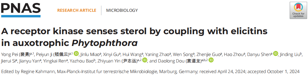 10月30日,ac米兰官方网站植物保护学院窦道龙教授团队破解疫霉菌感知利用寄主甾醇的独特机制。相关文章“A receptor kinase senses sterol by coupling with elicitins in auxotrophic Phytophthora”发表在《PNAS》期刊。