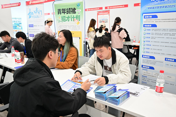 与此同时,11月3日上午,江苏农垦、潍柴雷沃、华智生物、优宁维、今世缘酒业等44家知名企业携500多个岗位亮相“‘十百千万’农业新质人才培养工程”南农校园招聘会。为2025届本硕博”毕业生提供生物科技、机械制造、农业、人工智能等多个领域的就业选择。活动现场同学们与企业代表积极互动交流,一些企业当场与同学们达成录用意向。