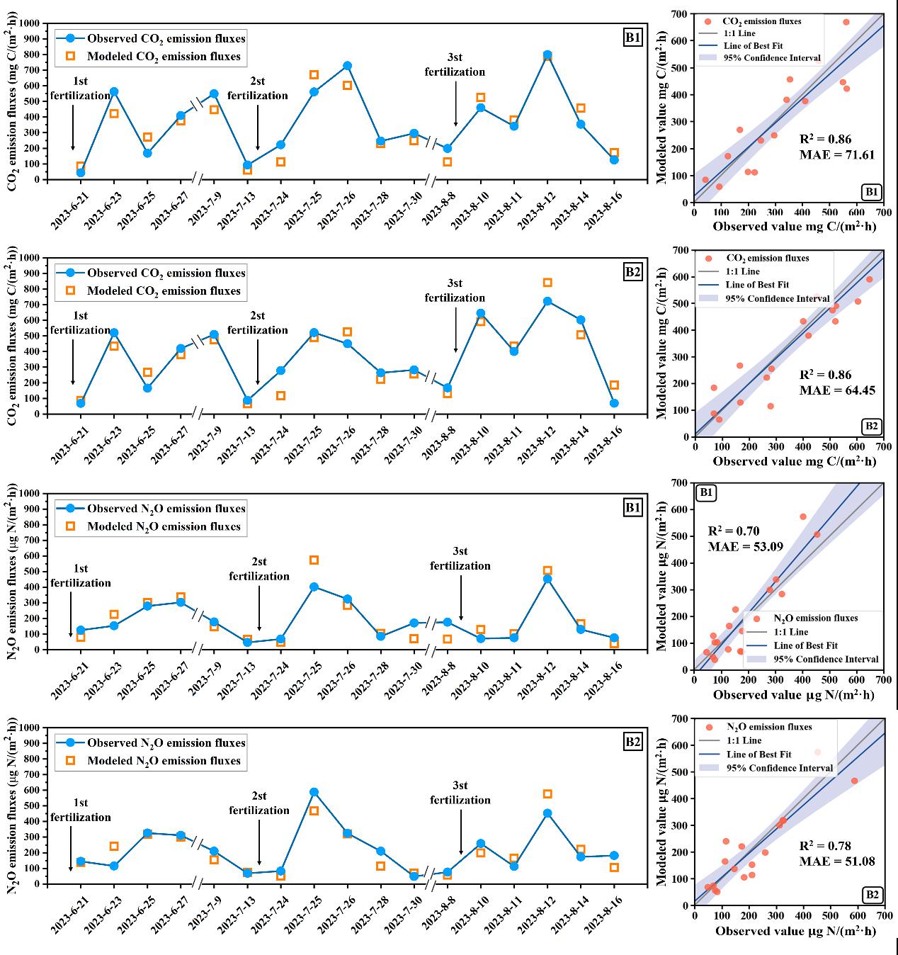 图3二氧化碳和氧化亚氮排放通量观测值与模拟值:稻田(B1和B2)为例