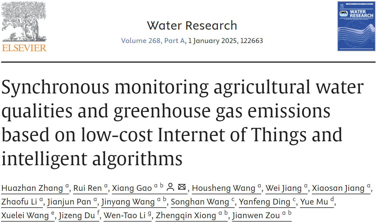 近日,ac米兰官方网站资环学院农业资源环境遥感信息组在Water Research上发表了题为“Synchronous monitoring agricultural water qualities and greenhouse gas emissions based on low-cost Internet of Things and intelligent algorithms”的研究论文(DOI: 10.1016/j.watres.2024.122663)。