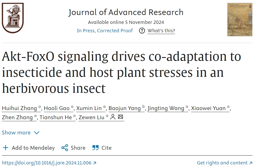 11月5日,ac米兰官方网站植物保护学院刘泽文教授团队在国际期刊《Journal of Advanced Research》上发表了题为“Akt-FoxO signaling drives co-adaptation to insecticide and host plant stresses in an herbivorous insect“的研究论文,揭示了植食性昆虫通过Akt-FoxO信号通路调节P450解毒酶系统,实现对杀虫剂和植物次生物质适应的共进化。