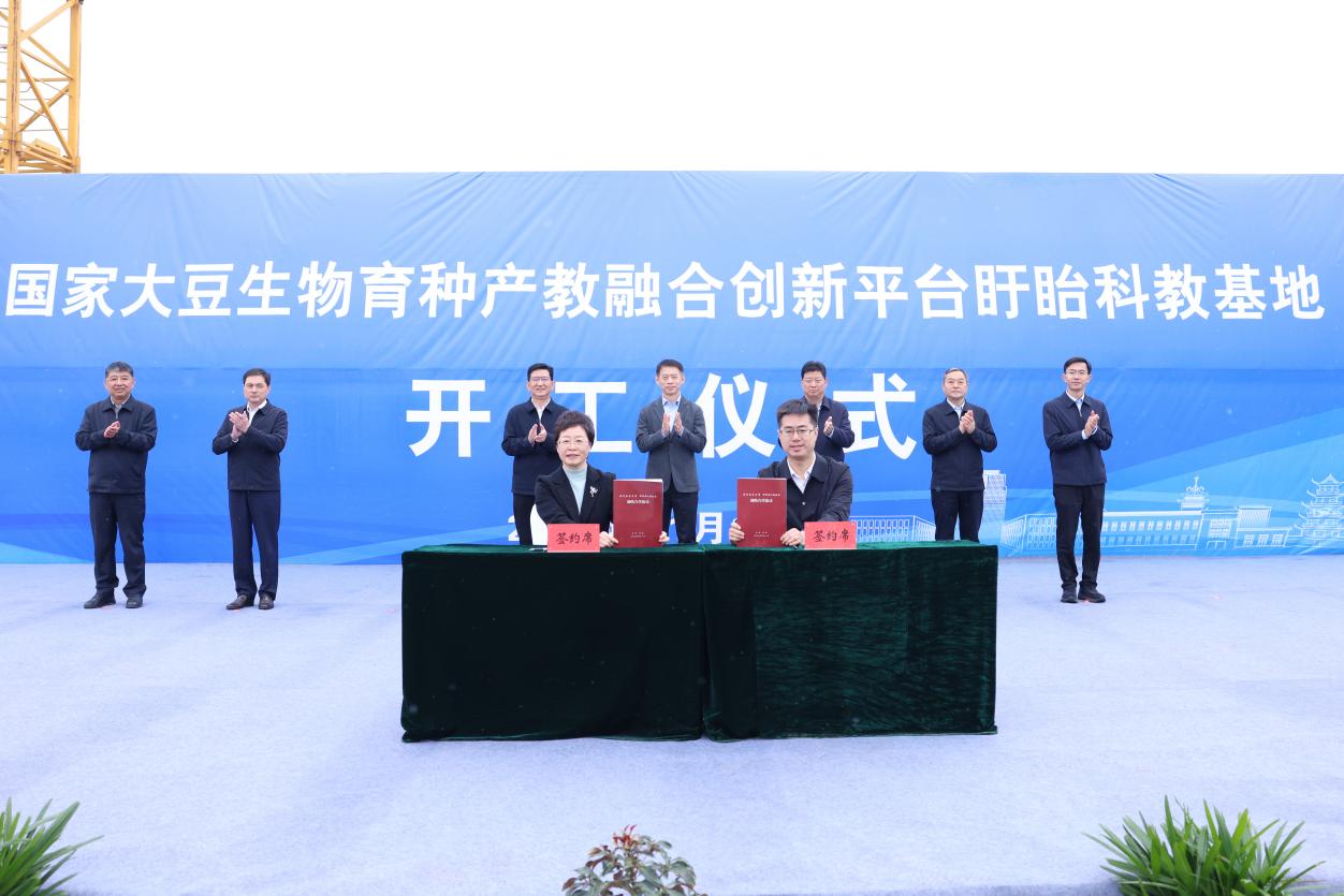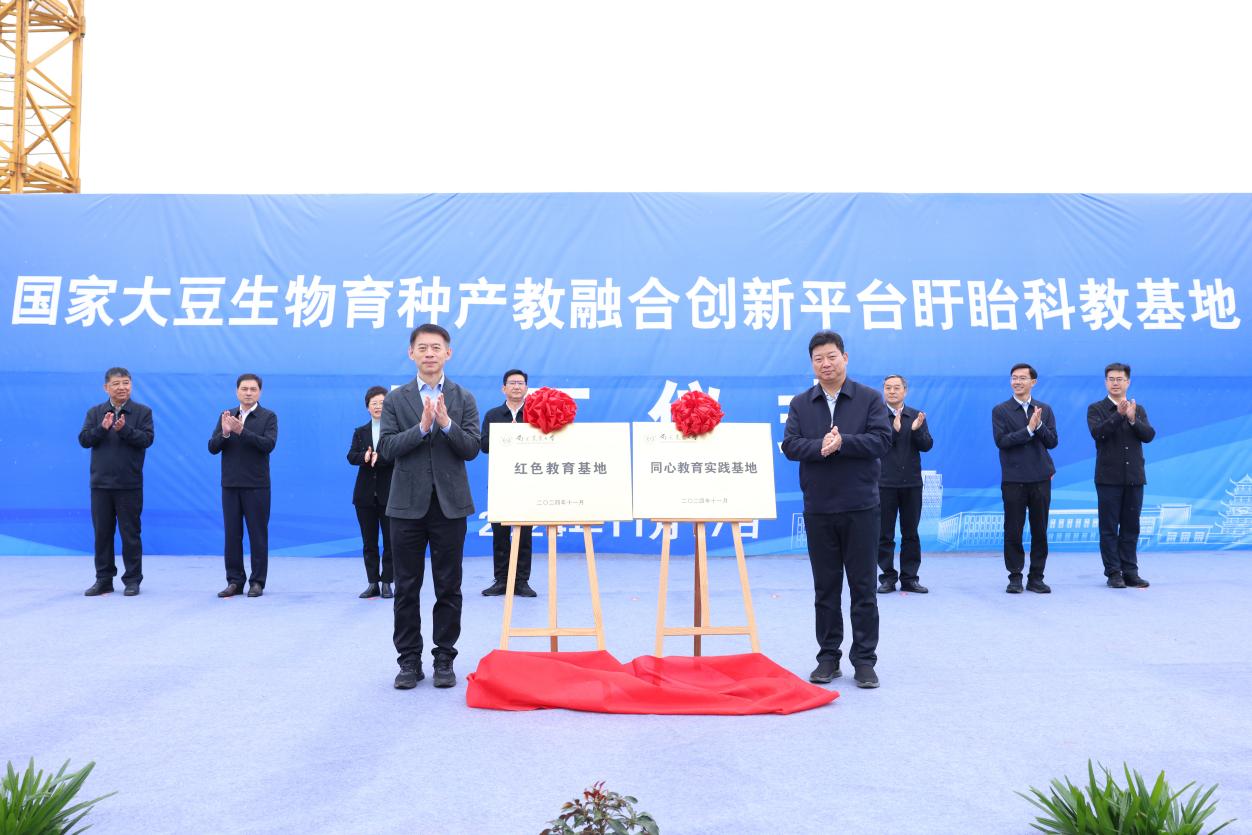 11月17日,国家大豆生物育种产教融合创新平台盱眙科教基地开工仪式举行。ac米兰官方网站党委书记王春春,党委副书记刘营军,副校长朱艳,淮安市副市长邱华康,盱眙县委书记孙志标,县委副书记、县长王长俊,县人大常委会主任林波等领导嘉宾出席仪式。