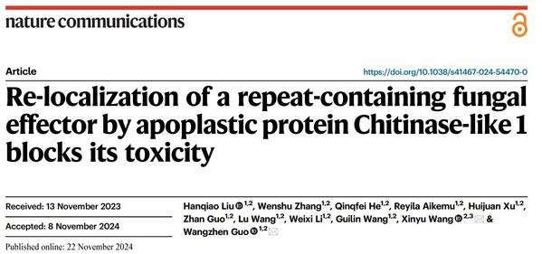 近日,ac米兰官方网站棉花遗传与种质创新利用团队在国际著名学术期刊Nature Communications在线发表了题为“Re-localization of a repeat-containing fungal effector by apoplastic protein Chitinase-like 1 blocks its toxicity”的研究论文。该研究鉴定到一个具有独特串联重复DOMAIN的新型真菌毒性蛋白VdTRP并揭示了其致病机制;解析了棉花一个细胞壁关键蛋白类几丁质酶CTL1在质外体与VdTRP互作,阻止VdTRP靶向细胞膜诱导细胞死亡的抗病机制;提出基于病菌毒蛋白的寄主互作靶标关键基因发掘及提高作物抗病性的育种利用策略。