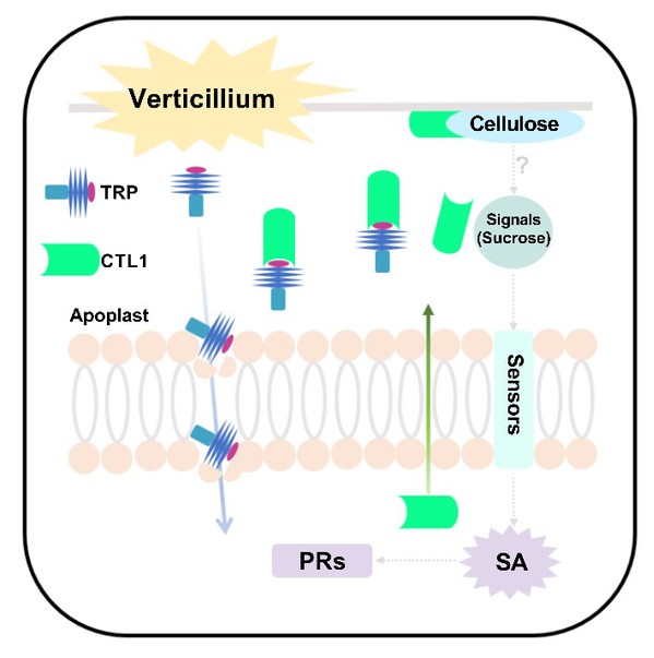 图1. 质外体蛋白CTL1阻止新型毒蛋白VdTRP破坏细胞膜,诱导植株提高免疫,增强棉花对黄萎病抗性的工作模式图