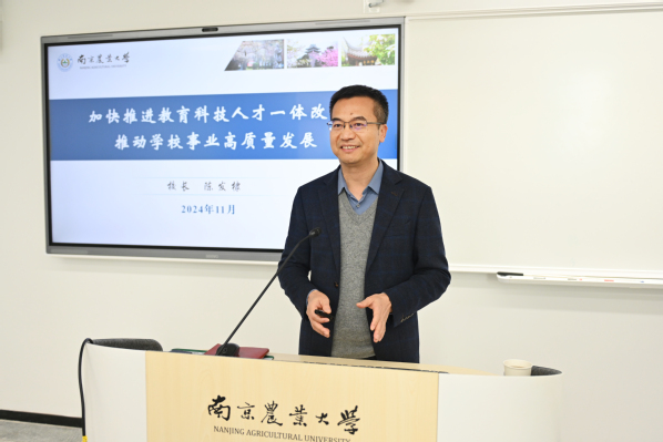 11月29日上午,校长陈发棣走进“形势与政策”课堂,以“加快推进教育科技人才一体改革,推动学校事业高质量发展”为主题,为资源与环境科学学院的同学们带来一堂农味思政课。