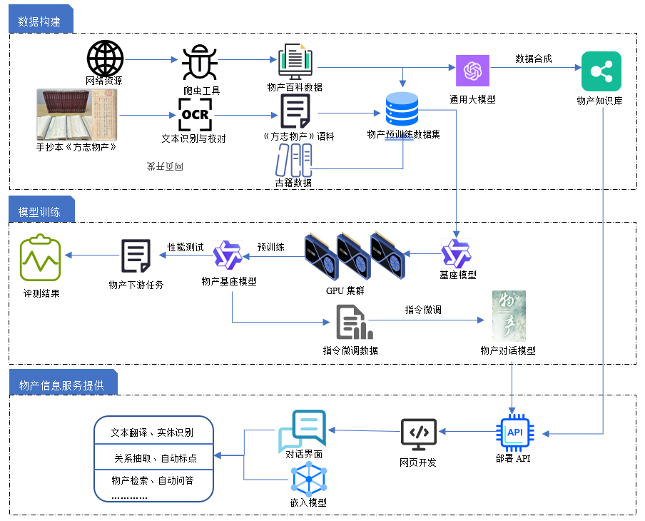 此次发布的中华物产大模型是一个集合了多家机构数据资源、算力资源和算法资源的系统工程。整体构建过程分为物产大模型预训练语料构建、预训练模型训练、对话模型构建与知识库问答实现三大板块。