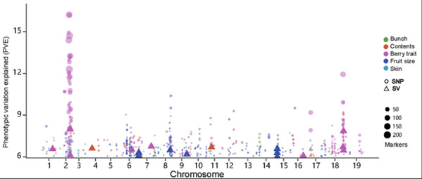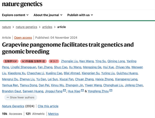 近日,ac米兰房经贵教授团队与中国农业科学院深圳农业基因组研究所(岭南现代农业科学与技术广东省实验室深圳分中心)周永锋团队在《自然·遗传学(Nature Genetics)》上合作发表了题为“Grapevine pangenome facilitates trait genetics and genomic breeding”的研究论文。该研究基于首个驯化葡萄Grapepan v1.0图泛参考基因组的组装,研究构建了包含单核苷酸变异(SNP)、插入缺失变异(InDel)和结构变异(SV)的葡萄基因型图谱与重要育种性状的表型图谱。进一步通过系统的群体遗传学与数量遗传学挖掘,解析了葡萄复杂农艺性状的遗传基础,定位了29个农艺性状相关的数量性状基因位点(QTLs),并发现SVs对农艺性状缺失的遗传力有显著贡献。通过整合机器学习算法、基因型图谱、表型图谱和数量遗传学分析,该研究提出了葡萄多性状的全基因组选择育种模型,成功构建了葡萄全基因组选择育种体系。该体系将有效缩短育种年限、降低育种成本、提高育种效率,形成葡萄育种的新质生产力,为我国快速突破葡萄种业瓶颈奠定了基础。同时,这一研究的方法和模型也为其它多年生作物的遗传育种提供了参考和借鉴。