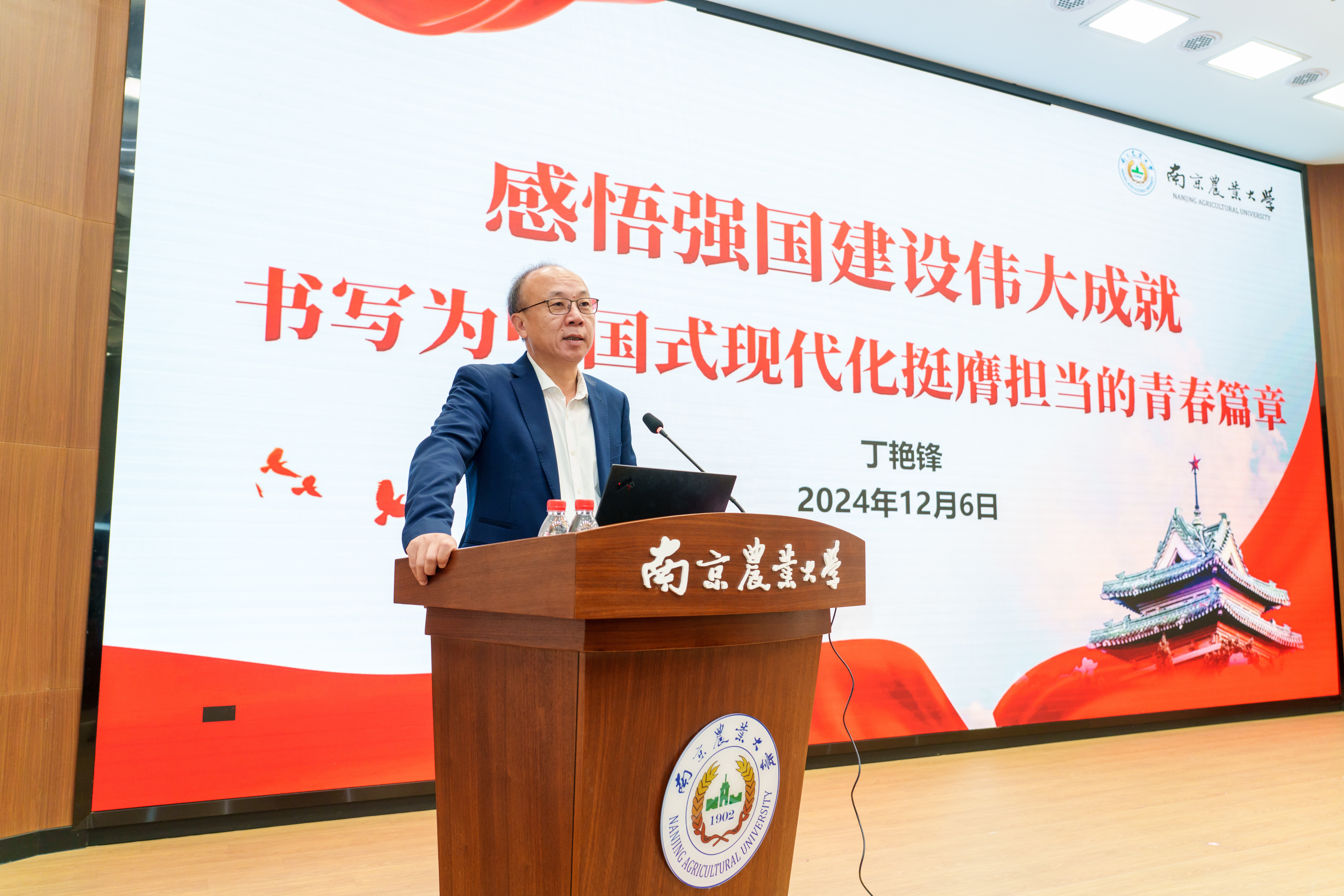 12月6日,副校长丁艳锋走进课堂,以“感悟强国建设伟大成就,书写为中国式现代化挺膺担当的青春篇章”为主题,为园艺学院近200名大一新生讲授《形势与政策》课,课程由园艺学院党委副书记石木舟主持。