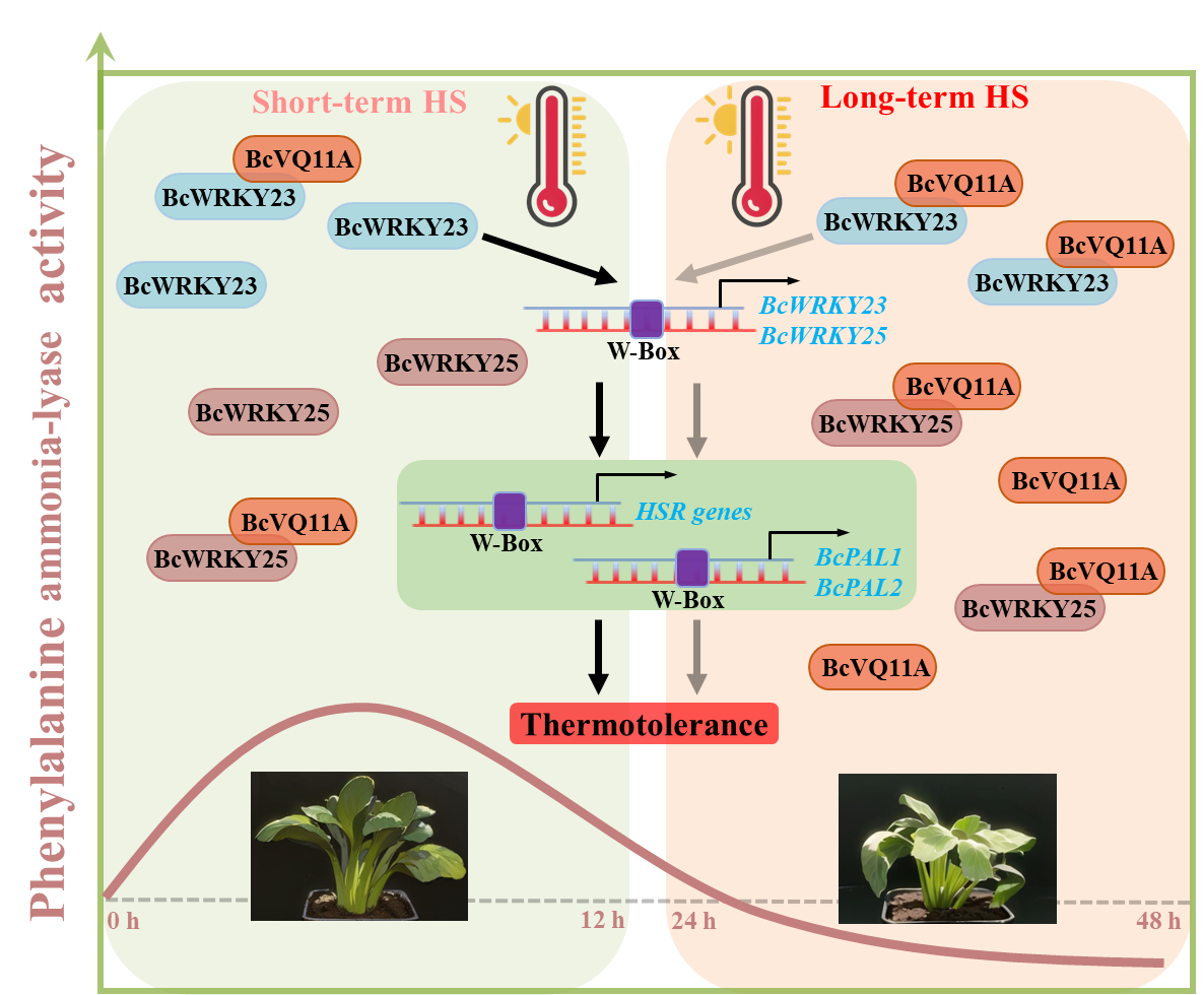 本研究发现不结球白菜受到热胁迫(HS)时,BcWRKY23被迅速诱导表达。短期HS作用下,BcWRKY23可以直接结合自身的启动子增强自身的表达。同时BcWRKY23直接结合BcWRKY25的启动子,并激活其表达,BcWRKY25也在短期HS下迅速积累。BcWRKY23和BcWRKY25通过激活热胁迫响应(HSR)基因的表达来提高不结球白菜的耐热性。同时,BcWRKY23和BcWRKY25共同激活BcPAL1和BcPAL2的表达,显著增强了短期高温下苯丙氨酸解氨酶的活性,从而增强了不结球白菜的耐热性。在长期HS下,BcVQ11A显著积累抑制了BcWRKY23和BcWRKY25的转录激活能力,使得BcPAL1和BcPAL2的表达也下调。最终导致苯丙氨酸解氨酶活性低于正常水平,使不结球白菜萎蔫(图1)。