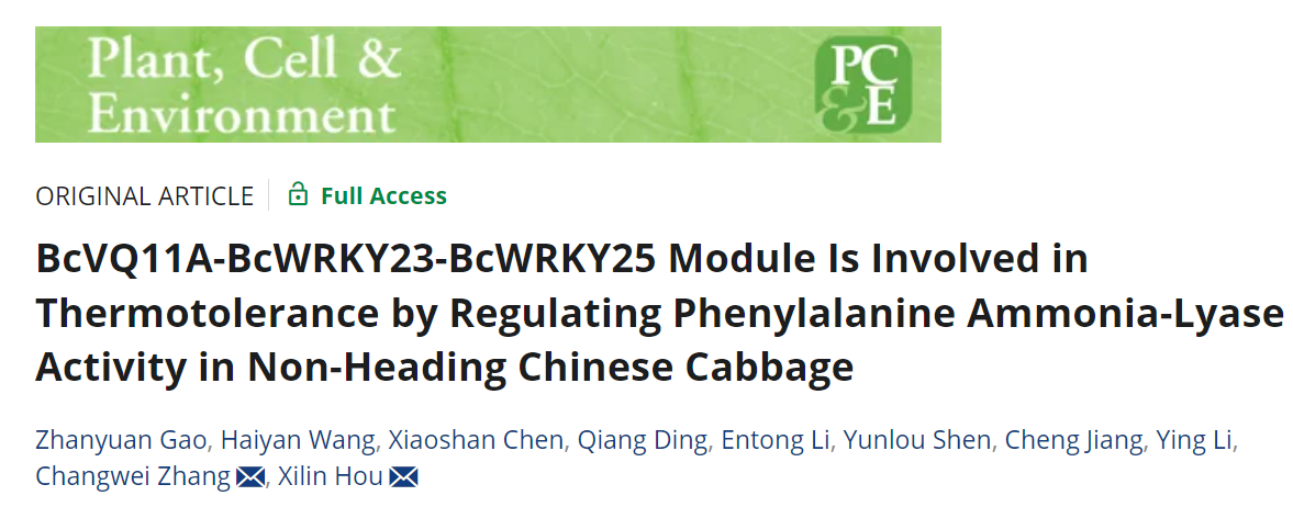 近日,Plant, Cell & Environment在线发表了ac米兰官方网站园艺学院侯喜林教授团队题为“BcVQ11A-BcWRKY23-BcWRKY25 module is involved in thermotolerance by regulating phenylalanine ammonia-lyase activity in non-heading Chinese cabbage”的研究论文,揭示了BcVQ11A-BcWRKY23-BcWRKY25模块通过调节苯丙氨酸解氨酶活性参与不结球白菜耐热性调控的新机制。