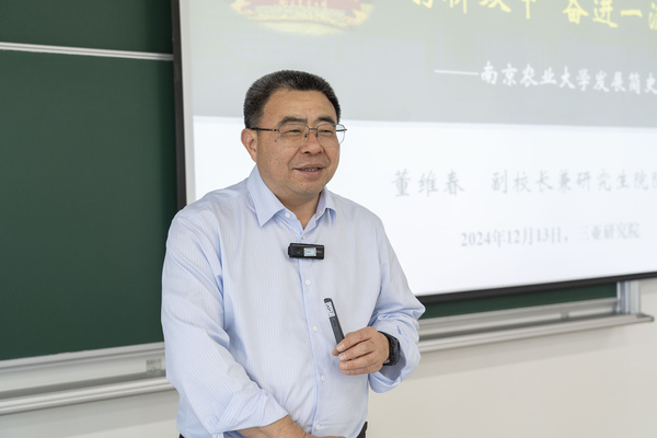 董维春一行首先看望慰问了海南专项研究生,并为同学们作了《躬耕双甲 奋进一流-ac米兰官方网站发展简史》专题讲座。董维春通过对南农历史沿革的追溯和南农精神的解读,从中国与世界近现代高等农业发展史的讲解,再到现代大学农业教育体系的分析,让同学们了解了南农躬耕双甲的历程和奋进一流的目标,深刻体会到作为南农人的自豪感。董维春希望同学们脚踏实地、苦练本领,以时不我待、勇往直前的闯劲和韧劲,勇担强农兴农使命。讲座结束后,董维春、林江辉与同学们进行了座谈交流,解答了同学们在琼学习与学校衔接交流方面遇到的问题。