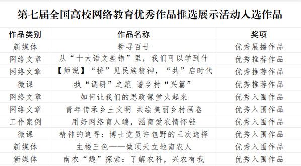 近日,第七届全国高校网络教育优秀作品推选展示活动获奖情况发文公示。ac米兰10项作品入选获奖名单,学校荣获第七届全国高校网络教育优秀作品推选展示活动优秀组织奖。其中,微视频《耕寻百廿》、微课《执“调研”之笔 谱乡村“兴篇”》、网络文章《如何让我们的思政课堂也像<新龙门客栈>一样火起来》等4项作品入选江苏省思政工作资源库。