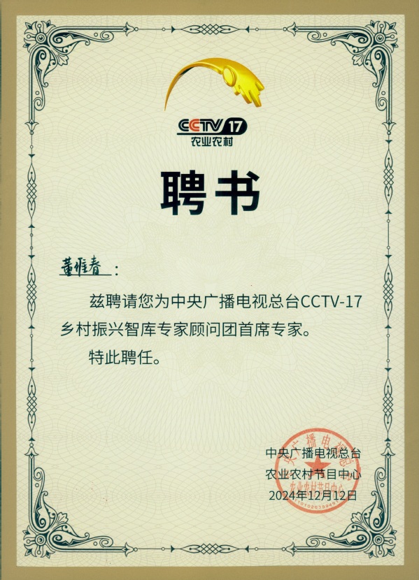 在本次论坛上,董维春受聘为中央广播电视总台CCTV-17乡村振兴智库专家顾问团首席专家。