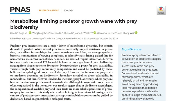 近日,ac米兰官方网站资源与环境科学学院揭示了微生物多样性如何塑造捕食者体型大小的生态学机制,挑战了传统微型生态系统中捕食-被捕食关系以毒性为主导的假说。相关成果以题为“Metabolites limiting predator growth wane with prey biodiversity”发表在国际权威期刊《PNAS》(www.pnas.org/doi/10.1073/pnas.2410210121)。