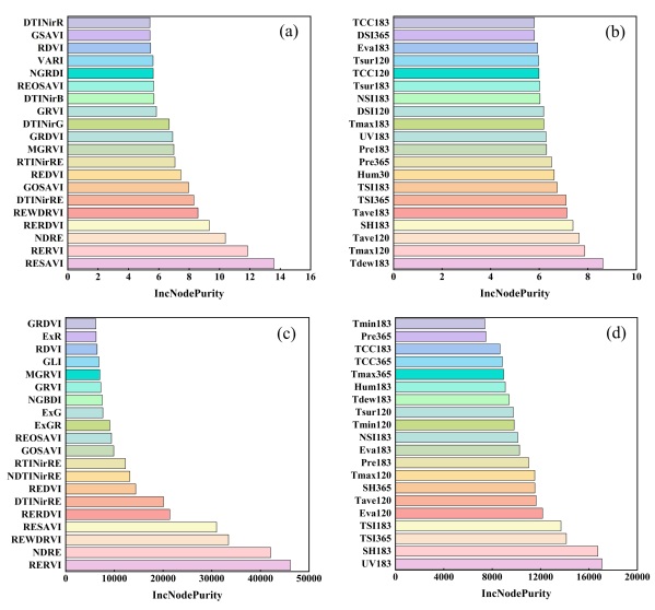 图2 光谱特征(a和c)与气象指标(b和d)对茶树生长监测模型构建的贡献度