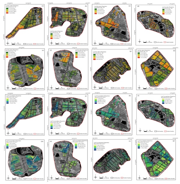 随着茶园管理逐渐向集约化发展,急需适用于不同规模茶园的树体长势精准管理策略。研究选取了江苏省8个具有代表性的茶园作为研究对象,核心区面积涵盖8.33至39.01公顷。研究团队通过无人机遥感系统获取茶园遥感影像,同时收集了各茶园的气象数据。采用参数优化算法分别耦合随机森林、弹性回归网络和偏最小二乘回归方法进行茶树叶片生物量和和氮素积累量监测模型构建。研究结果表明,含红边信息的光谱特征在茶树叶片生物量与氮积累量估测中表现最好,传统机器学习在耦合参数优化算法后模型精度得到显著提升(图1),其中结合三种光谱特征的叶片生物量(R2= 0.76)和氮素积累量(R2= 0.76)监测模型的精度最高。以90和183天为时间区间构建的温度、辐射、降水指标对叶片生物量和氮素积累量监测具有更高的贡献度(图2),其与光谱特征的结合进一步提高了茶树生长监测模型(R2= 0.79-0.80)的精度。研究同时利用高清无人机影像结合GIS平台对各茶园地块进行数字化处理,量化了地块空间位置、数量、面积等属性,最终将茶树生长监测模型与茶园地块数字信息相结合,评估了8个茶园的树体生长空间变异情况(图3;CV = 5.28% ~ 15.90%)。研究为茶树生长定量化监测和数字化管控提供了重要技术支持。