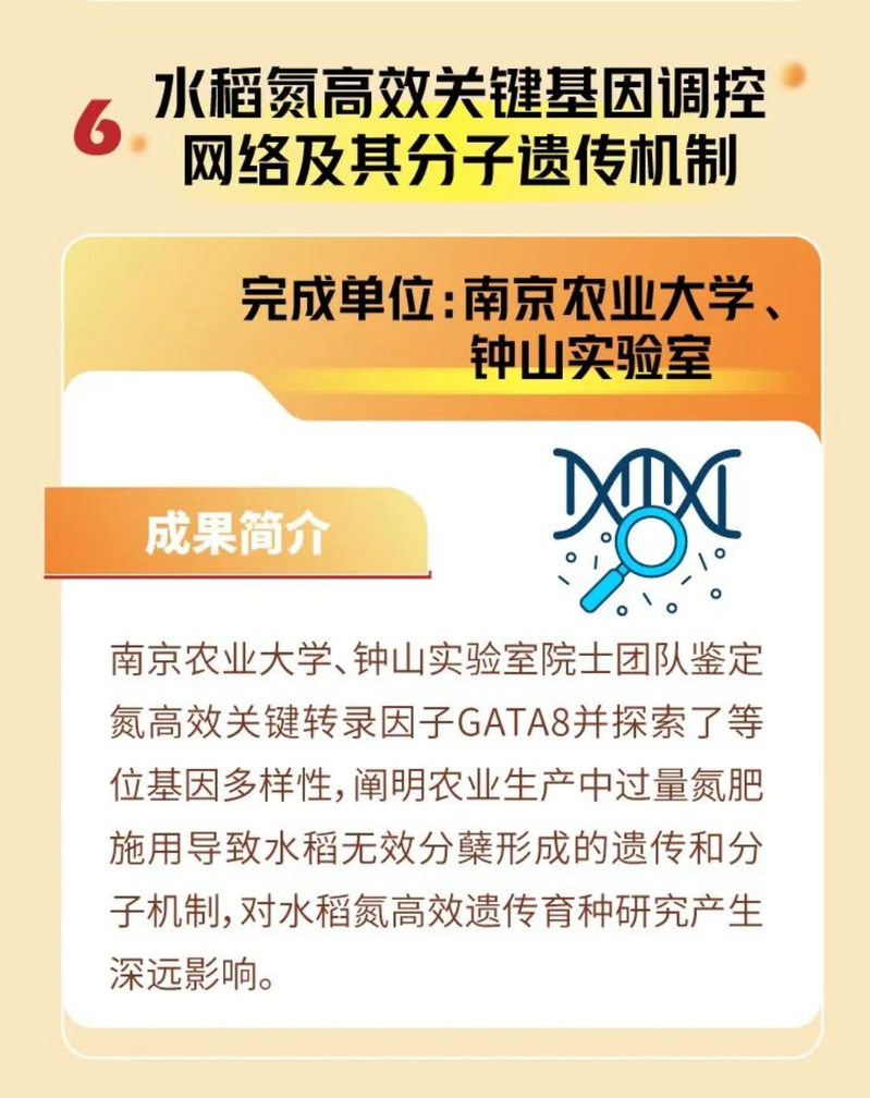 单位面积有效分蘖数是决定水稻单产的关键因素之一。过量施用氮肥导致无效分蘖过量生长,抑制水稻有效分蘖的形成,从而降低水稻产量和氮素利用效率。解析过量氮肥导致无效分蘖产生的遗传机制,是氮高效水稻新品种培育中的关键。通过观测水稻遗传群体和育种群体的全生育期的分蘖和氮利用效率表型,克隆了水稻氮高效核心转录因子OsGATA8,阐明了农业生产中过量氮肥施用导致水稻无效分蘖形成的遗传和分子机制。与此同时,发掘了OsGATA8的优异单倍型OsGATA8-H,并结合基因编辑和回交育种技术创制了优异氮高效育种材料。
