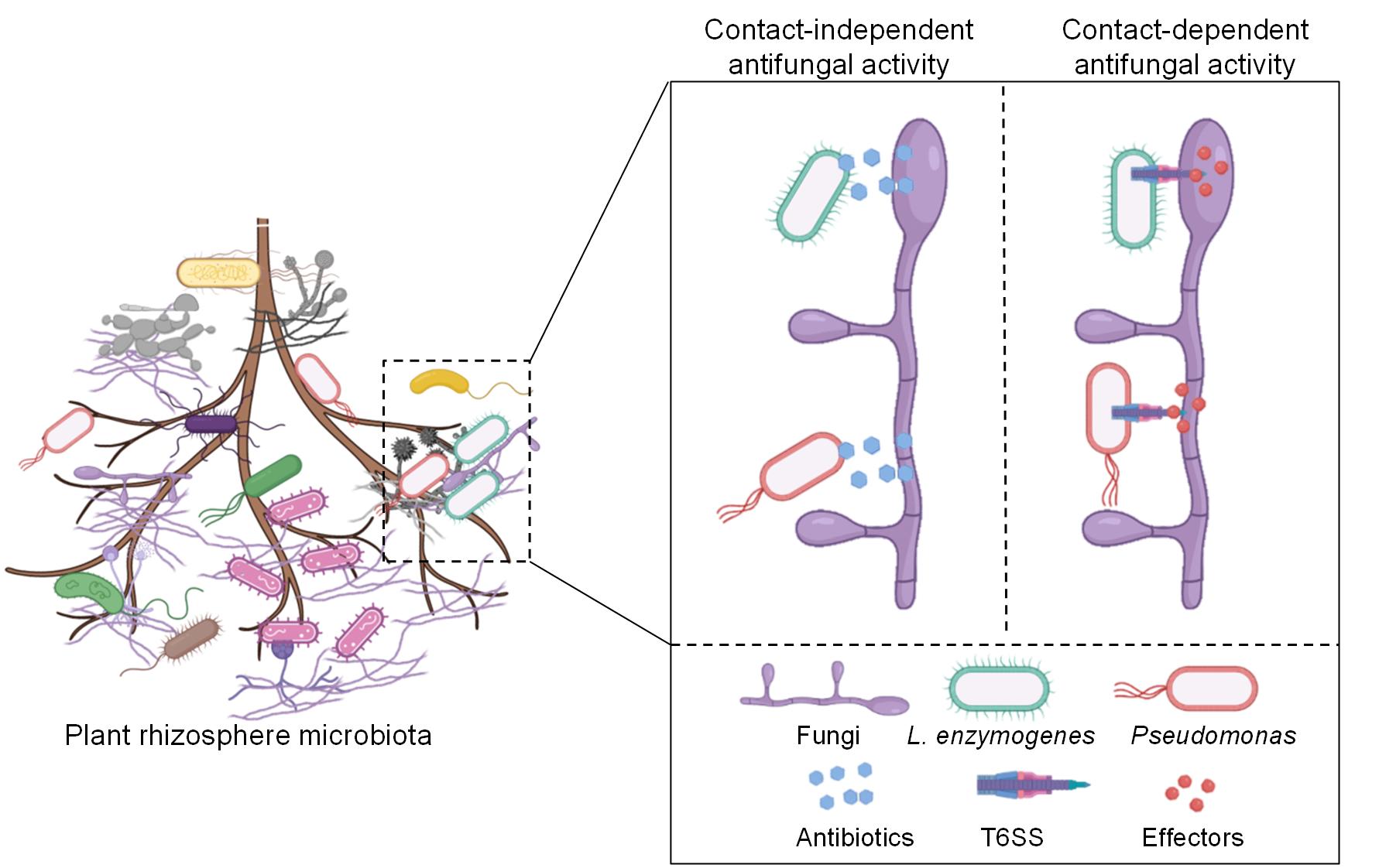 细菌与真菌的互作对人类及植物健康具有深远的影响,其中生防细菌通过多种机制有效抑制病原真菌的生长和致病性,成为作物病害绿色防控的重要资源。生防细菌的作用机制多样,其中最具代表性的是其分泌的抗菌代谢产物,这一过程并不依赖于生防细菌与病原菌的直接接触。传统的生防研究主要关注细菌产生抗菌代谢产物的能力,然而近年来,细菌间依赖细胞接触的互作方式逐渐受到重视。