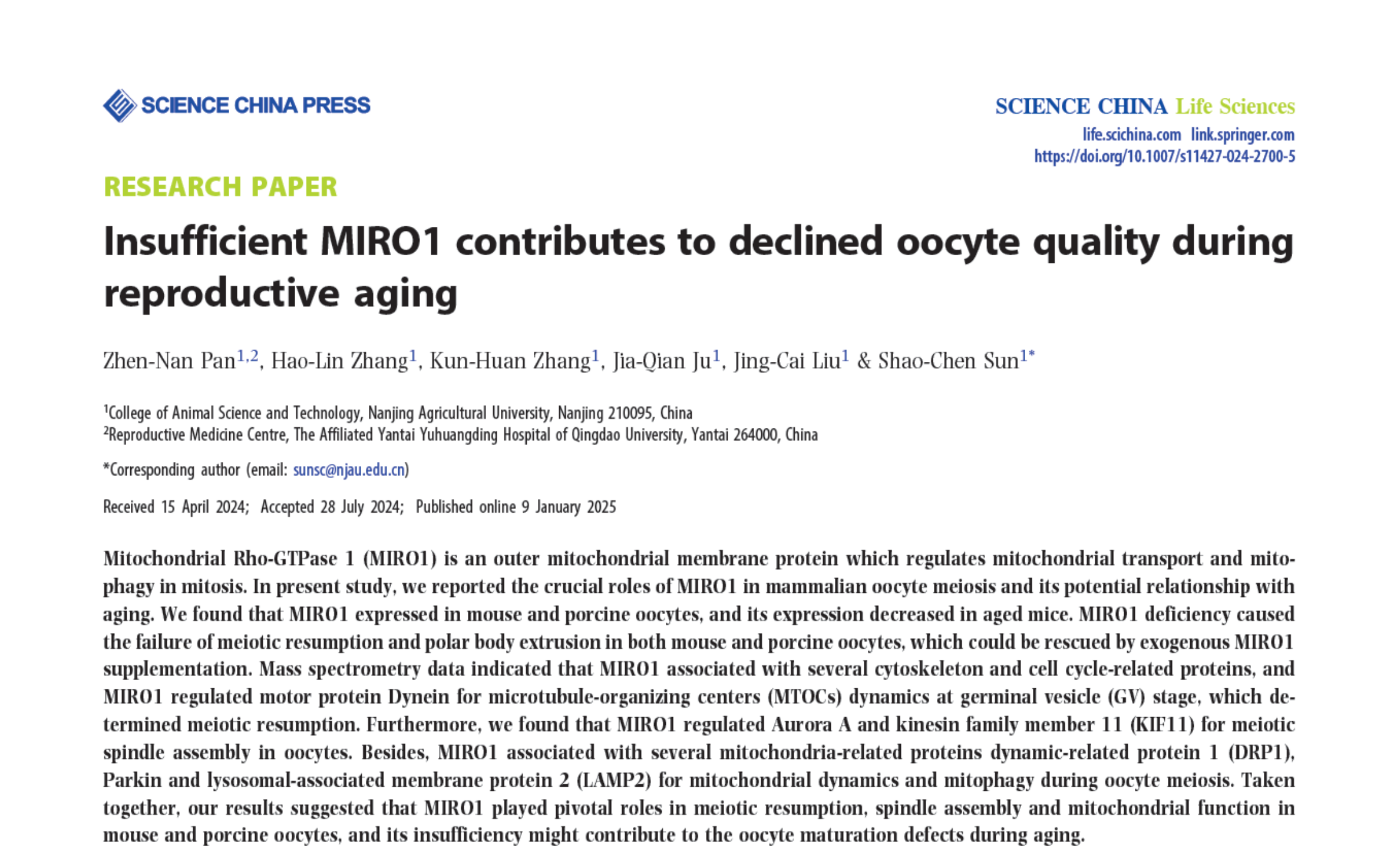 1月9日,ac米兰官方网站动物科技学院孙少琛课题组在Science China Life Sciences期刊在线发表了题为:Insufficient MIRO1 contributes to declined oocyte quality during reproductive aging的研究论文,该研究报道了线粒体运输蛋白MIRO1在猪等哺乳动物卵母细胞减数分裂中的关键作用及其表达不足影响衰老卵母细胞成熟质量下降的潜在机理。