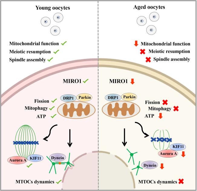 本研究发现MIRO1在猪卵母细胞成熟过程中均有表达,且定位在线粒体附近。在猪卵母细胞中破坏MIRO1活性引起极体排出失败,初步结果发现猪卵母细胞GV期和MI期微管的组装受到影响,MI期线粒体分布异常。进一步研究发现在高龄卵母细胞中MIRO1表达降低,暗示老化卵母细胞质量下降与MIRO1功能失调有关。进一步采用模式动物研究相关调控机制,发现MIRO1缺失引起的卵母细胞成熟缺陷可以通过注射外源性MIRO1 mRNA挽救。质谱数据表明MIRO1与多种微管和线粒体相关蛋白有关。在卵母细胞生发泡时期,MIRO1通过调节Dynein介导的MTOC动力学影响后续减数分裂恢复;在卵母细胞第一次减数分裂中期,MIRO1通过调节Aurora A和驱动蛋白KIF11影响卵母细胞减数分裂纺锤体组装。此外,免疫共沉淀实验发现MIRO1与线粒体相关蛋白DRP1结合调节卵母细胞线粒体分裂、与Parkin和LAMP2互作进而促进线粒体自噬。