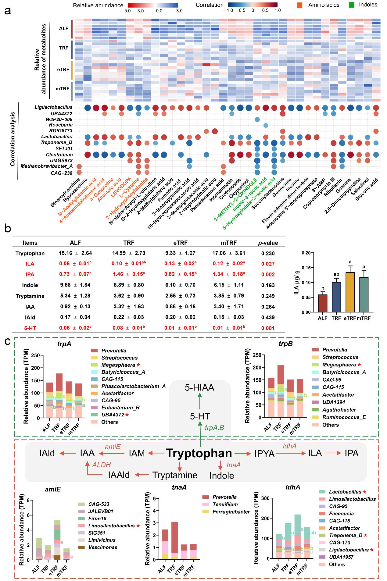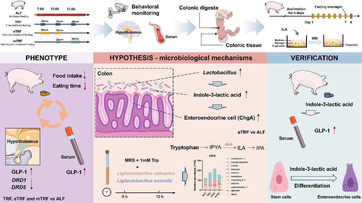本研究以生长猪为模型进行限时饲喂试验,监测生长猪的采食行为,采集下丘脑组织进行转录组学测序,检测下丘脑与血清中胃肠激素的水平,明确限时饲喂影响生长猪采食行为的表型。结果发现,限时饲喂能够影响长期食欲的调节,具体表现为采食量减少、每日进食时间缩短、下丘脑和血清中GLP-1的水平升高,以及下丘脑奖赏相关通路受到抑制。为了进一步探究影响GLP-1水平升高的潜在因素,对回肠和结肠组织进行肠道干细胞和分泌型细胞的标志基因进行检测,利用宏基因组学测序和代谢组学测序技术对肠道微生物及其代谢物进行测定,挖掘介导微生物-宿主相互作用的关键分子。结果发现,与自由采食(ALF)相比,早间限时饲喂(eTRF)能够增加结肠内分泌细胞的数量,促进肠道内Lactobacillus定植,影响微生物色氨酸代谢,提高代谢物吲哚-3-乳酸(ILA)的水平。
