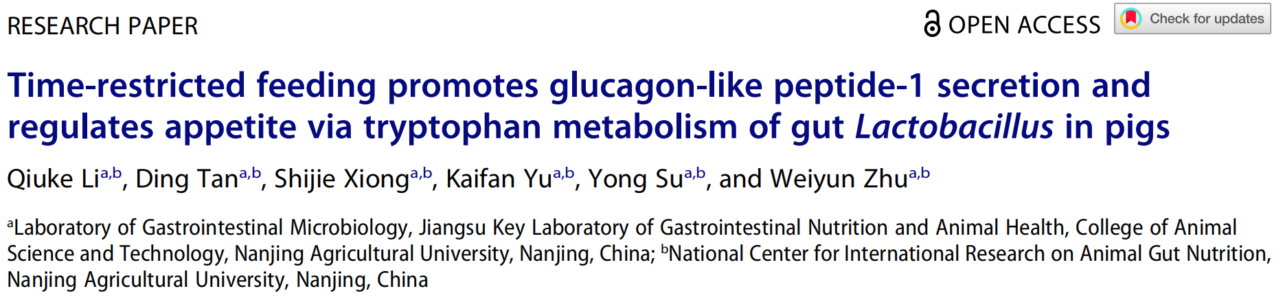 2月15日,ac米兰官方网站动物科技学院苏勇教授和余凯凡副教授课题组在《Gut microbes》发表了题为“Time-restricted feeding promotes glucagon-like peptide-1 secretion and regulates appetite via tryptophan metabolism of gutLactobacillusin pigs”的研究论文,该文揭示了限时饲喂模式通过肠道乳酸菌的色氨酸代谢影响生长猪GLP-1分泌和食欲调节的新机制。