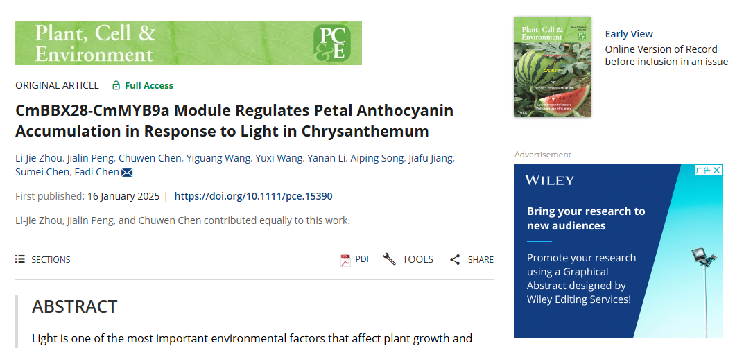 近日,ac米兰官方网站园艺学院菊花遗传与种质创新团队在Plant, Cell & Environment在线发表题为"CmBBX28-CmMYB9a Module Regulates Petal Anthocyanin Accumulation in Response to Light in Chrysanthemum"的研究论文,揭示了CmBBX28-CmMYB9a分子模块在响应光照调控菊花花青苷生物合成及花瓣着色中的新机制。