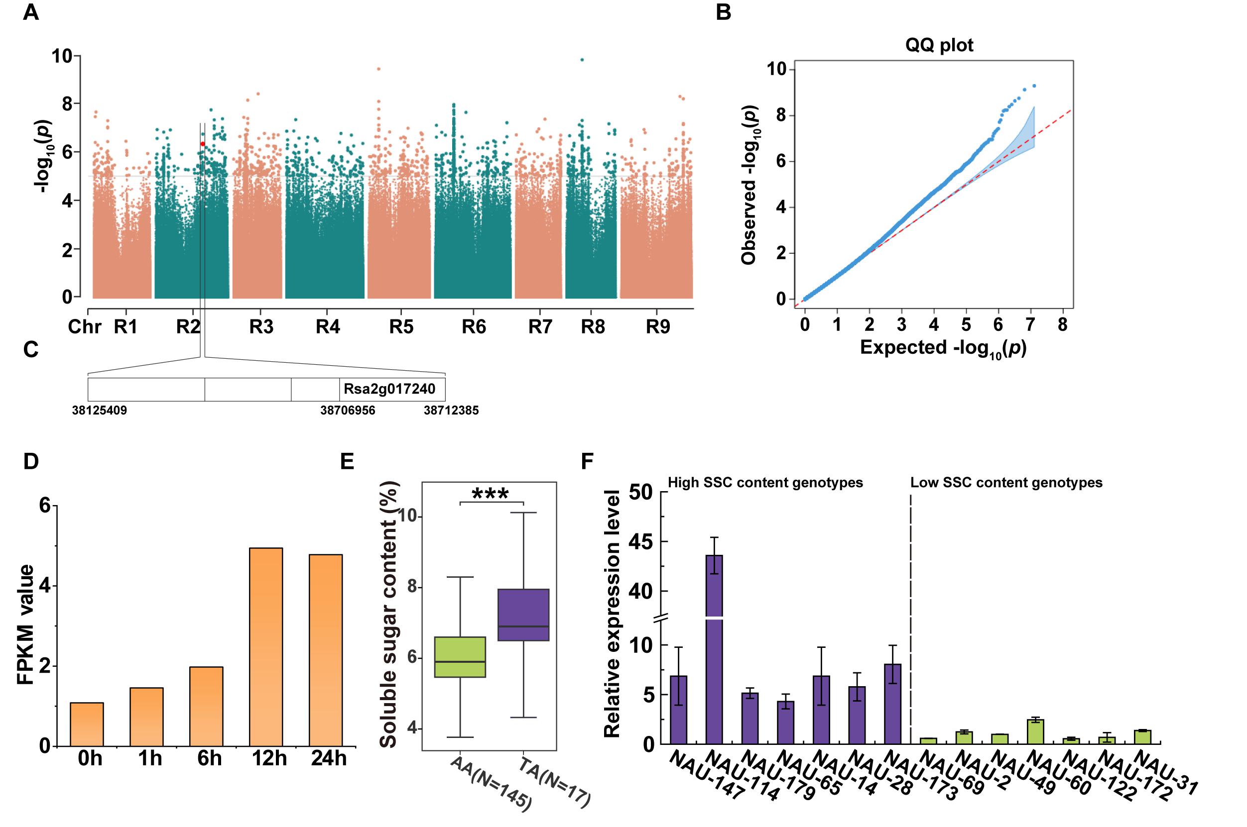 该研究通过全基因组关联分析鉴定到RsSPS1是控制蔗糖合成的候选基因(图1),基因功能分析表明RsSPS1可调控萝卜蔗糖含量,同时其表达受到冷胁迫显著诱导。过表达RsSPS1可提高萝卜的耐冷性,RsSPS1抑制表达后萝卜的冷敏感性增强,肉质根形成层活性明显下降,表明该基因在萝卜响应低温胁迫时发挥正向调控作用。