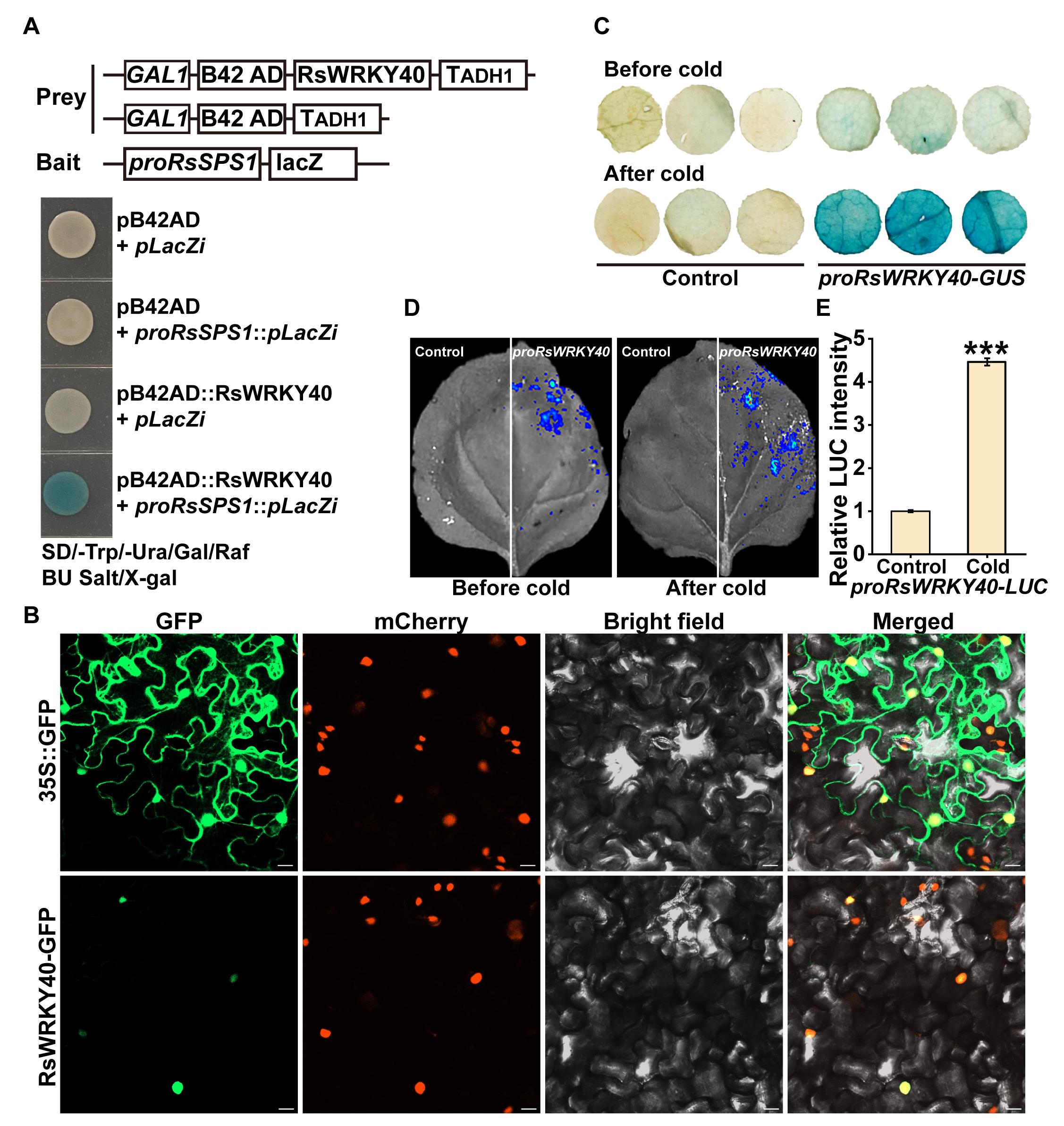 图2受冷诱导的RsWRKY40定位于细胞核并转录激活RsSPS1的表达