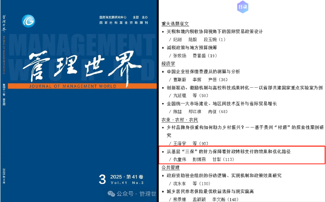 近日,以经管院仇童伟副教授为第一作者的合作论文《从基层“三保”的财力保障看财政转移支付的效果和优化路径》发表于《管理世界》2025年第3期。