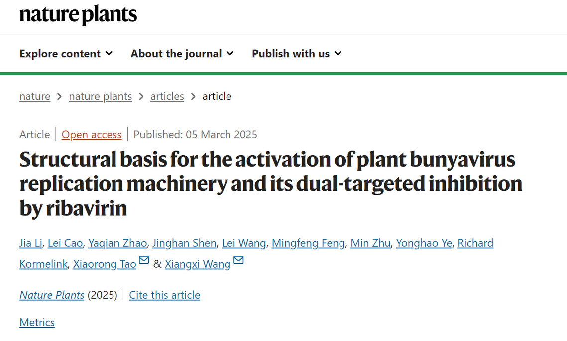 3月5日,ac米兰官方网站陶小荣教授团队联合中国科学院生物物理研究所王祥喜研究员团队,在全球植物学顶级期刊《Nature Plants》在线发表突破性研究成果,首次解析番茄斑萎病毒(Tomato spotted wilt virus,TSWV)RNA复制酶全长三维结构,为靶向抗病毒新农药研发开辟全新路径。这项历时六年的研究攻克了植物病毒学领域复制酶结构解析的重点难题,揭示了复制酶激活及其双靶点抑制的分子机制,使人们得以窥见植物病毒遗传物质复制机器的“庐山真面目”。
