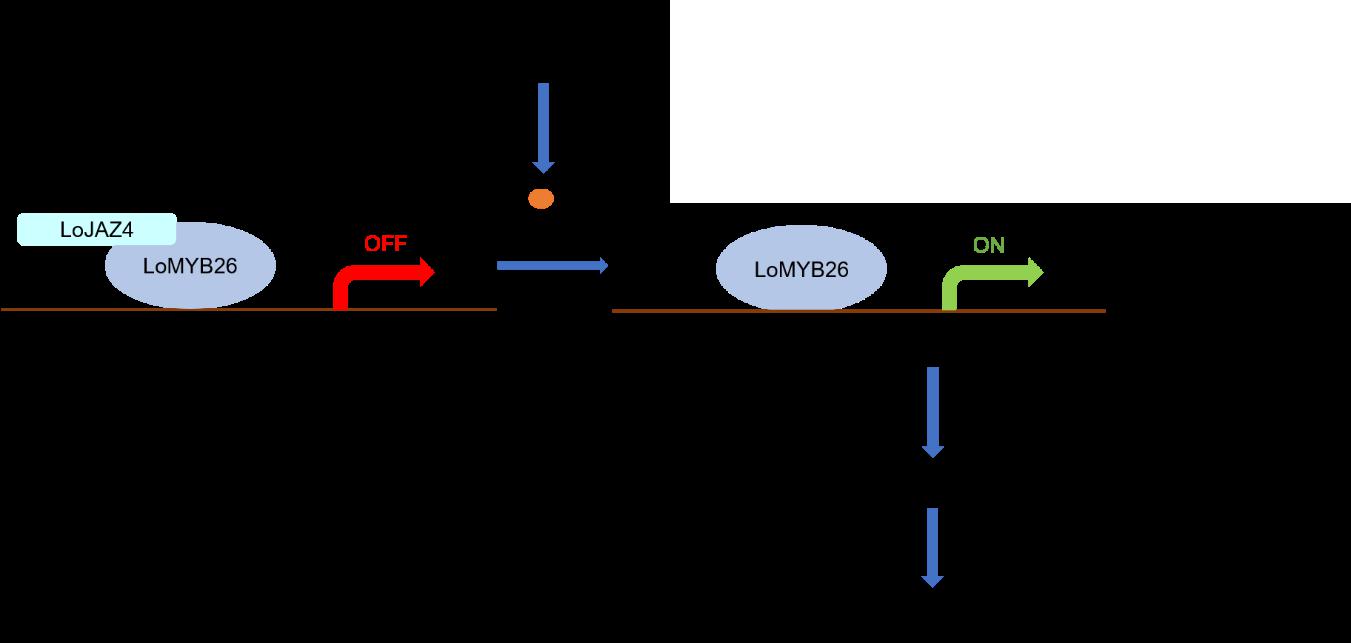 发表在Journal of Advanced Research的论文对百合不同发育阶段花药木质化程度进行了研究,通过联合分析花药开裂转录组,筛选到了一个转录水平变化与药室内壁木质化进程相一致的转录因子,LoMYB26。对LoMYB26的功能鉴定,发现其促进百合药室内壁木质化并且能调控木质素相关合成酶基因LoPAL2、LoCOMT和Lo4CL2的表达。Y1H,EMSA,Dual-Luc实验结果表明LoMYB26可以直接结合LoCOMT启动子并激活其表达。基于实验室前期茉莉酸(Jasmonicacid,JA)促进花药开裂的研究结果(He et al., 2023, Scientia Horticulturae),我们猜测JA可能介导药室内壁木质化。花药中JA激素免疫原位结果暗示JA与药室内壁木质化存在关联。进一步的研究表明,Me-JA处理能促进百合药室内壁木质化并诱导LoMYB26和木质素相关合成酶的表达。此外,JA信号途径关键调控因子LoJAZ4与LoMYB2互作,共同参与调控JA介导的药室内壁木质化和花药开裂。基于以上结果,我们提出了LoMYB26与LoJAZ4相互作用参与JA介导的药室内壁木质化和花药开裂的工作模型:当具有生物活性的JA (JA- ile, Me-JA)积累时,LoJAZ4被降解,并释放转录因子LoMYB26;LoMYB26直接与LoCOMT启动子结合,激活其表达,促进木质素在花药内壁的沉积和花药内壁的次生增厚,促使花药适时开裂。