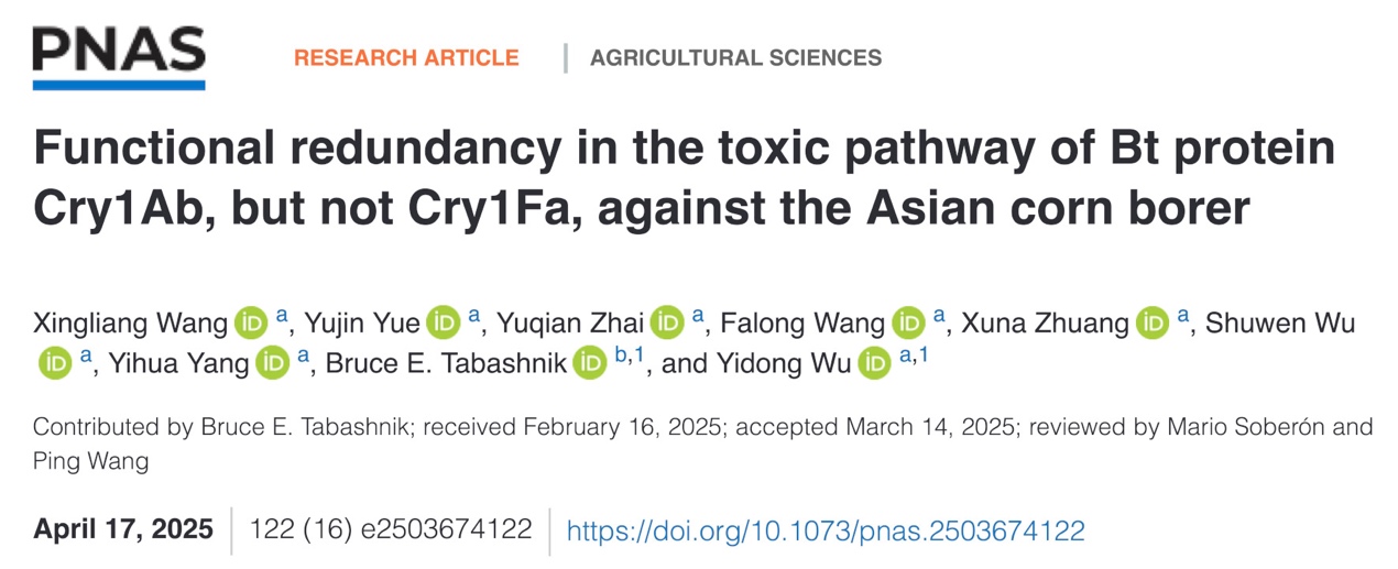 4月17日,ac米兰官方网站植物保护学院吴益东教授团队在《美国国家科学院院刊》(PNAS)发表了题为“Functional redundancy in the toxic pathway of Bt protein Cry1Ab, but not Cry1Fa, against the Asian corn borer”的研究论文,揭示了玉米螟对Bt蛋白Cry1Ab抗性风险低而对Cry1Fa抗性风险高的分子遗传机理,为Bt玉米的可持续利用提供了关键科学依据。ac米兰官方网站王兴亮教授为论文第一作者,吴益东教授与美国亚利桑那大学Bruce Tabashnik教授为共同通讯作者。