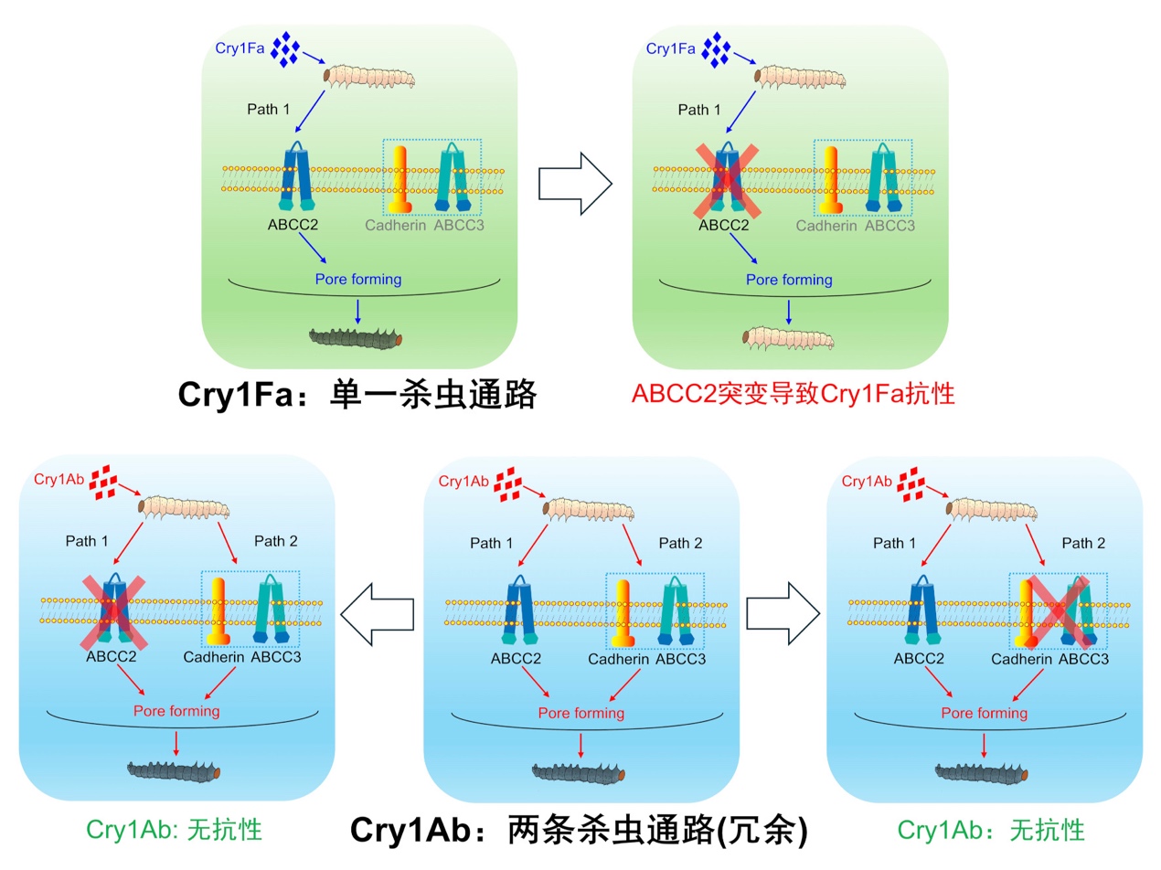 田间抗性监测数据显示,表达Cry1Fa的Bt玉米在加拿大种植12年后,欧洲玉米螟就产生了抗性;而表达Cry1Ab的Bt玉米在种植21年后仍对欧洲玉米螟保持优异防效。室内抗性筛选研究表明,玉米螟对Cry1Fa的抗性演化速度明显快于对Cry1Ab的抗性。本研究揭示了这一现象的奥秘:Cry1Fa因依赖单一杀虫通路,抗性风险较高;而Cry1Ab则具有两条冗余的杀虫通路,需要两种不同的受体同时突变才能产生抗性,从而显著降低了抗性风险。
