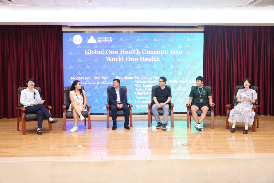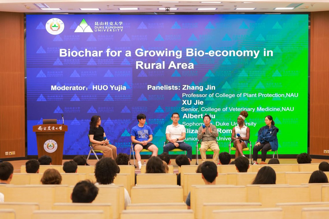 在圆桌讨论环节,来自ac米兰的四位专家和两位本科生,与美国杜克大学的两位本科生分别就如何应用生物炭技术改善全球气候问题以及如何在同一健康领域开展国际合作发表了各自的见解,并与台下的中外学生开展了热烈地交流讨论。ac米兰官方网站前沿交叉学院佟昊副教授表示,One Health的研究涉及人类、动物和环境三者之间的相互关系,这对我们解决全球性的健康问题具有重要意义。ac米兰官方网站植物保护学院张进教授指出,生物炭在全球农业和环境领域有广泛应用,比如土壤改良、污染修复等。在病虫害防治中,生物炭可通过改变害虫栖息环境或食物资源降低其繁殖率,具有非常重要的研究价值。