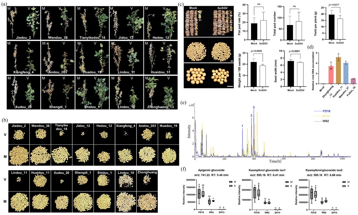 然而,大豆主栽品种对该病毒的抗性现状及可能存在的抗病机制仍然不清楚。 为进一步阐明其耐病分子机制,研究团队利用高通量转录组和非靶向代谢组学联合分析技术,比较了阜豆18与感病品种(Williams 82和中黄13)在SoSGV侵染和未侵染背景下的转录和代谢响应差异。综合分析结果表明,黄酮/异黄酮代谢途径在阜豆18的耐病性中发挥关键作用。随后,通过转基因手段在大豆中稳定过表达异黄酮合成关键酶基因IFS2,以及利用基于苹果潜隐球状病毒(ALSV)的VIGS系统沉默CHS1等关键基因,研究团队验证了黄酮/异黄酮通路与SoSGV耐病性的因果关系。这为解析大豆天然免疫机制提供了新视角,也为耐病基因的精准育种提供了分子靶点。目前,研究团队正在进一步鉴定阜豆18中富集的差异代谢物,并测试其在SoSGV防控中的潜在生物活性,以期从化学生态角度提供新的病毒抑制策略。