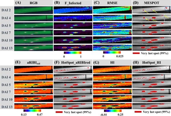 图2.不同接种后天数(DAI)下,基于MESPOT及其他稻瘟病敏感参数(aRIBIred, HI)提取的病斑空间分布图。