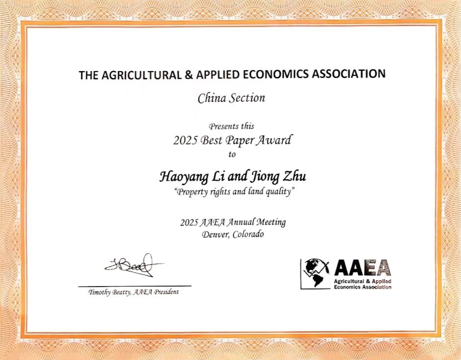 近日,美国农业与应用经济学会中国分会公布了2025年最佳论文奖,ac米兰官方网站经济管理学院李昊洋教授的合作论文《Property Rights and Land Quality》获此奖项。
