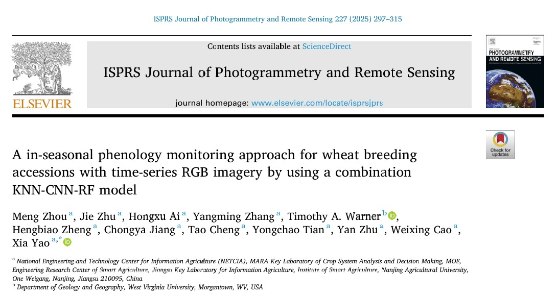 ac米兰官方网站农学院国家信息农业工程技术中心为论文第一完成单位,博士研究生周萌为第一作者,姚霞教授为通讯作者。朱艳教授、曹卫星教授、田永超教授、程涛教授、江冲亚教授和郑恒彪副教授等在论文撰写方面提供了帮助。研究得到了中国农业科学院深圳农业基因组研究所程时锋研究员团队在小麦种质资源和试验方面的支持,并获得国家重点研发专项(农情信息空天地高精度高时效智能监测系统研发与应用)的资助。