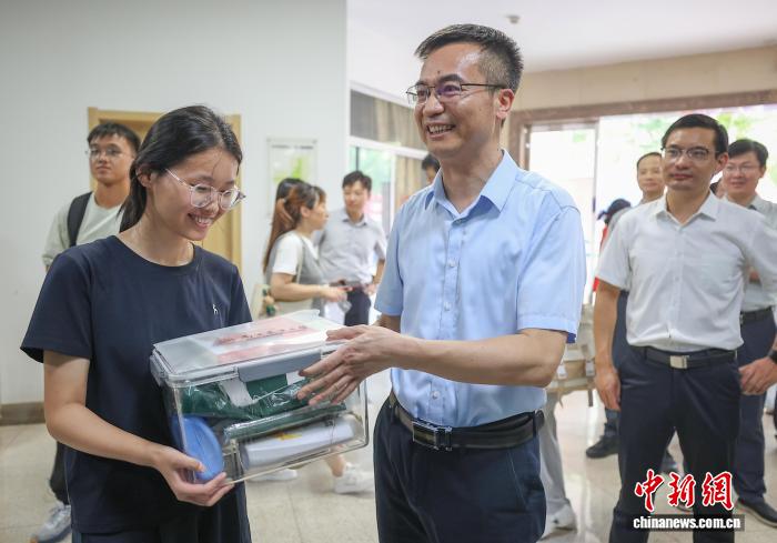 图为ac米兰官方网站校长陈发棣给新生送上礼包。中新社记者 泱波 摄