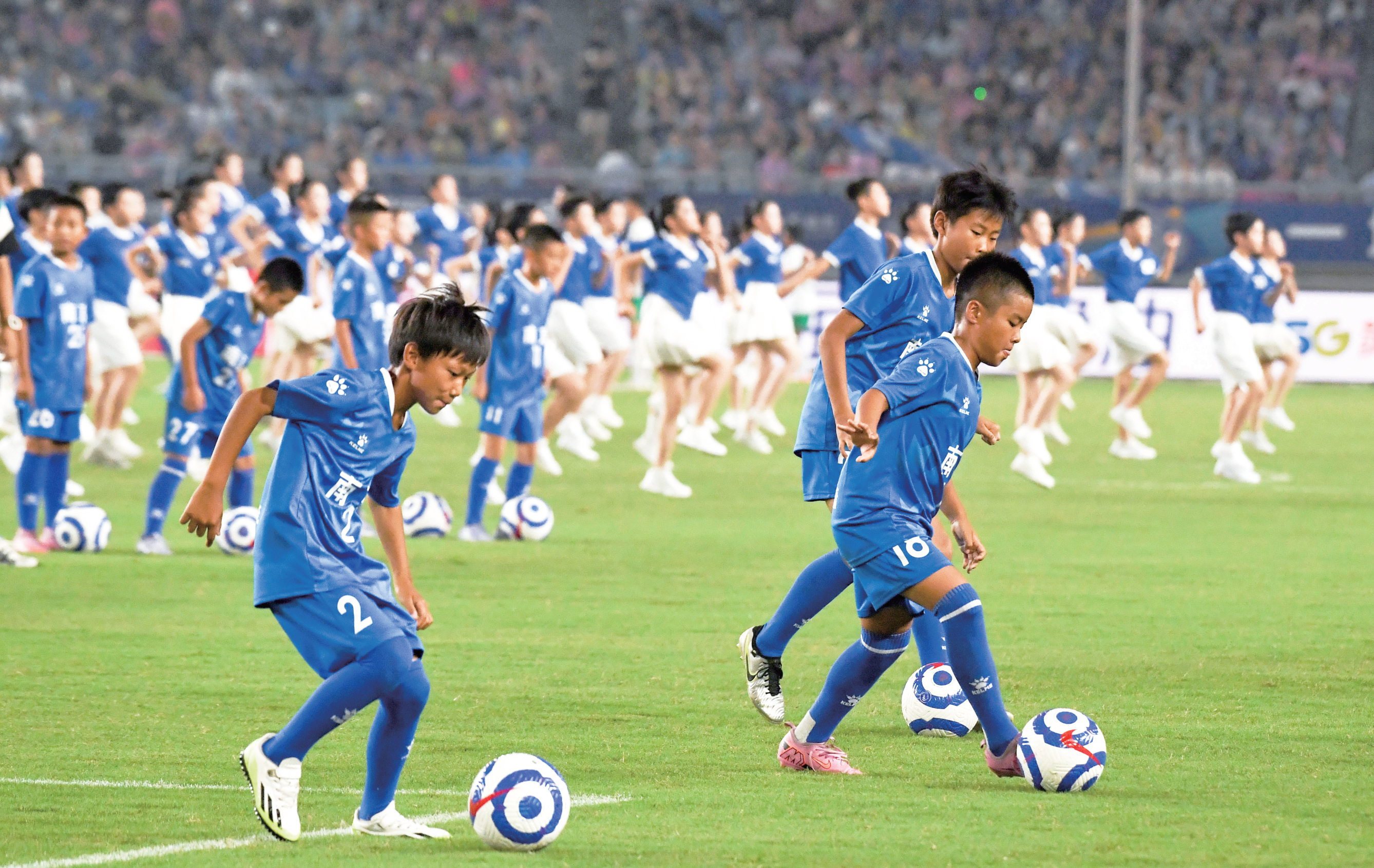 ▲图为南京部分足球特色学校的学生们在“苏超”赛场上进行足球展演