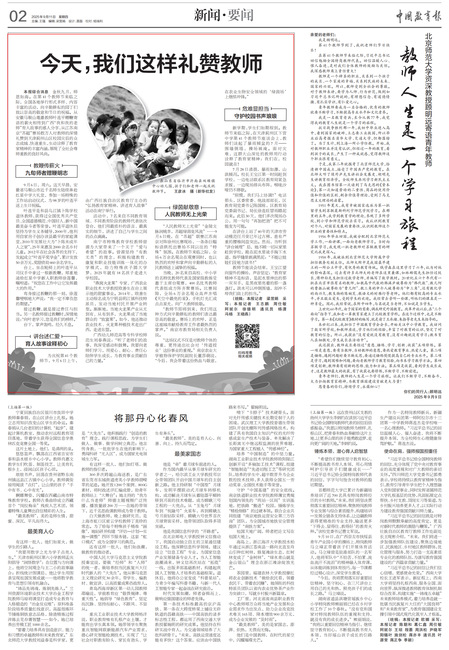 本报综合消息 金秋九月,师恩如海。在第41个教师节来临之际,全国各地举行形式多样、内容丰富的活动,向辛勤耕耘的园丁们致以崇高的敬意和节日的祝福。从安徽马鞍山耄耋教师叶连平赠鞭寄语的薪火相传到广西“我和我的老师”育人故事的感人分享,从江苏南京“苏超”赛场数万人对教师的深情礼赞到天津蓟州山区校园灾后的众志成城、快速重生,生动诠释了教育家精神的丰富内涵,展现了全社会尊师重教的良好风尚。